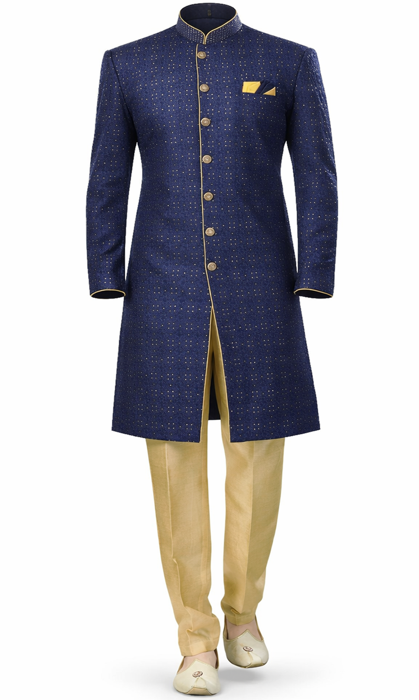 Set sail in style with this navy Sailor sherwani, where gold sequins shimmer like stars on the open water and matching gold pants complete your voyage. You'll navigate every celebration with effortless charm and confidence that makes waves.