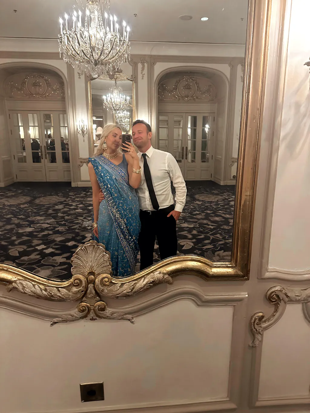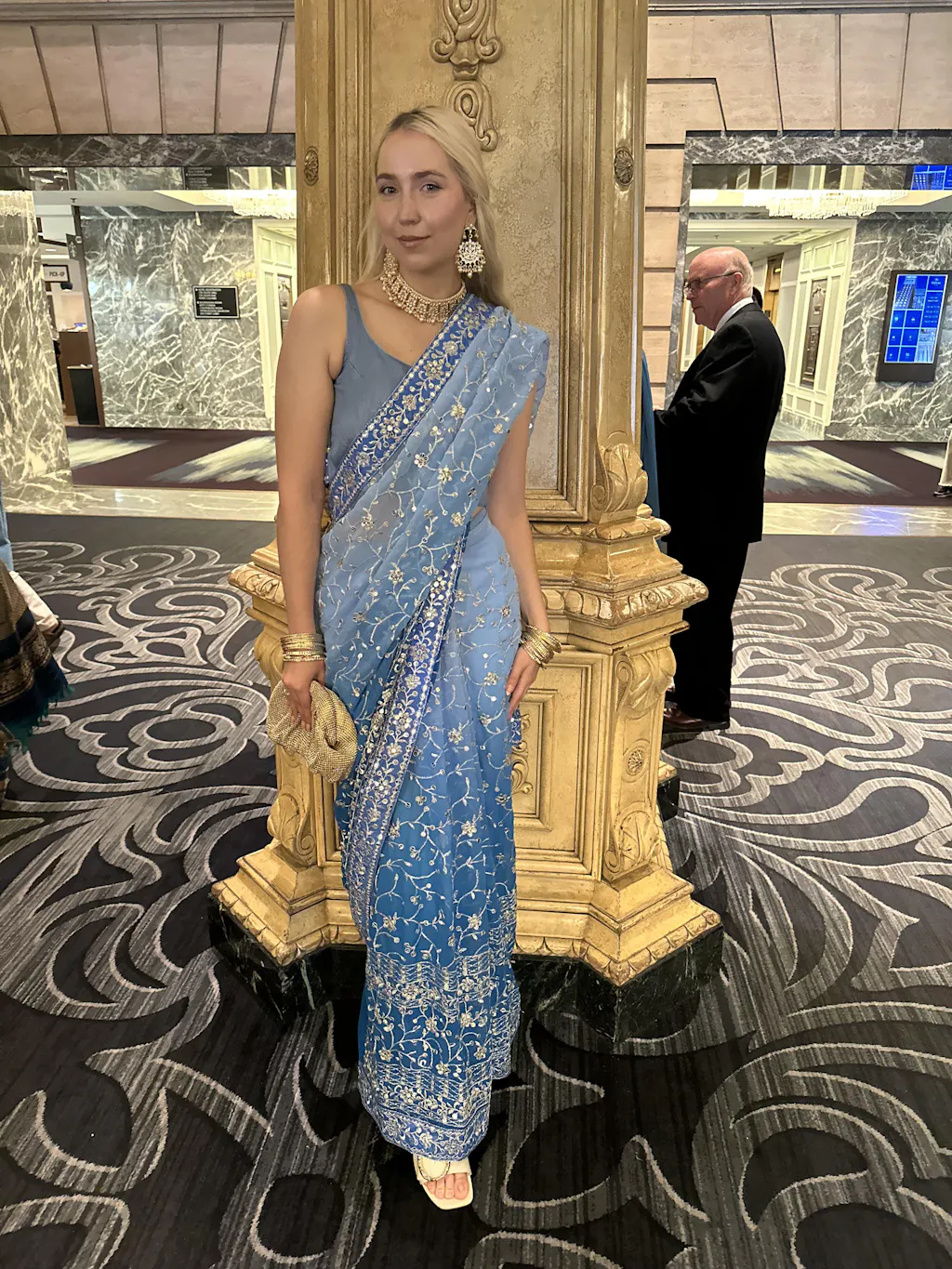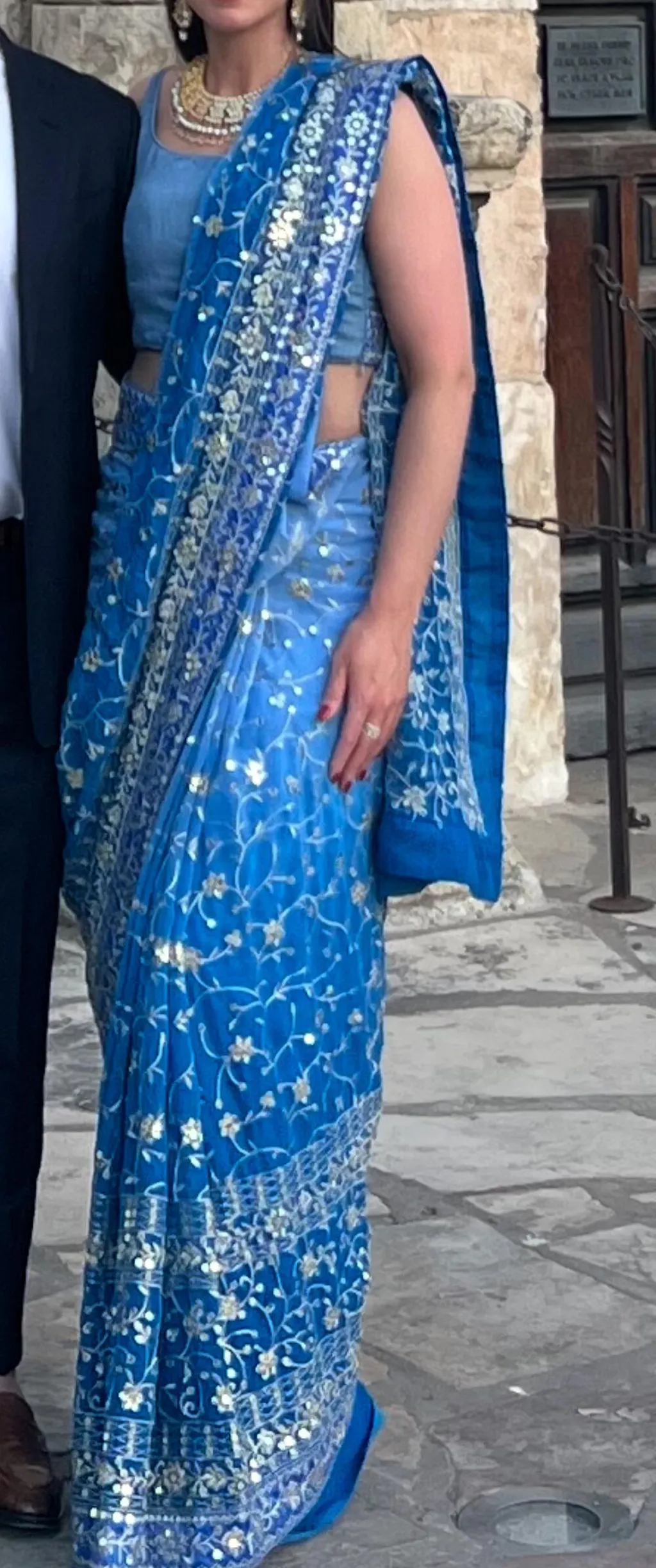 Stunning saree with shades of blue and shimmering silver embroidery all throughout!