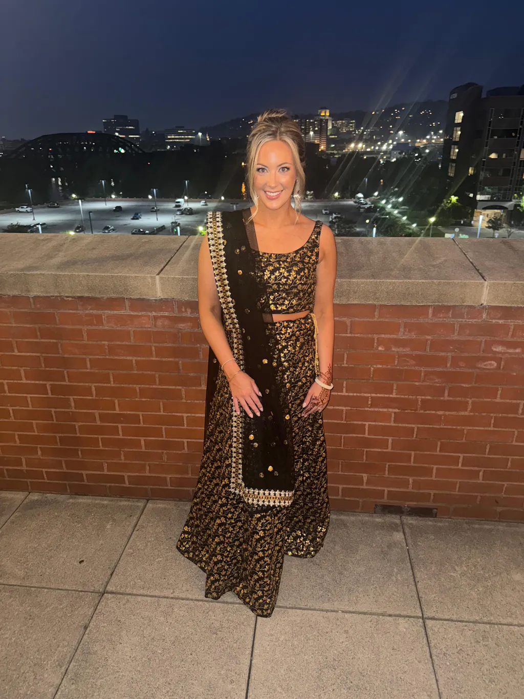All Hail! This gorgeous 3-piece black and gold lehenga set heavily embroidered with shiny gold floral patterns and sequins all throughout.
